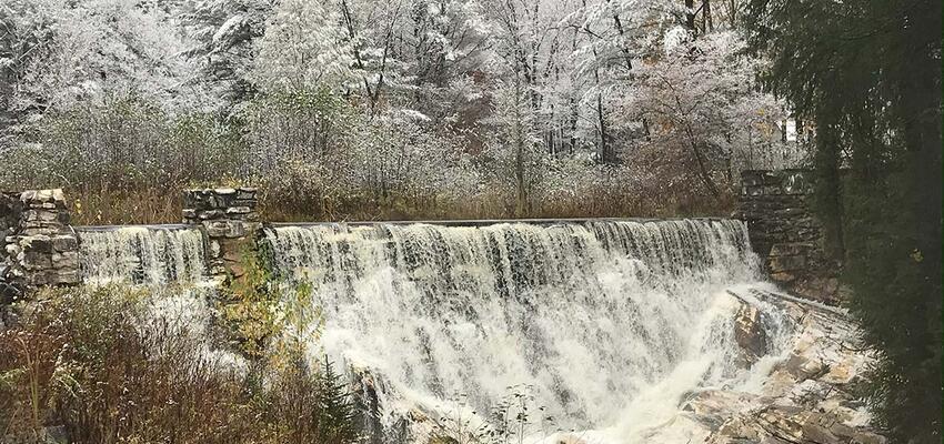 Discover a geologic wonder at this 48 acre park. Examine the only naturally formed white marble arch and man-made white marble dam in North America, and tour an abandonded marble quarry. The "natural bridge" for which the park is named, according to geologists, is 550 million years old bedrock mable, carved into an arch by the force of glacail melt water over 13,000 years ago; one of the best places in New England to demonstrate the effects of glaciation. The bridge spans rushing Hudson Brook as it twists and tumbles through a steep 60-foot deep gorge. This site was an active commercial quarry from 1810 to 1947, producing coarse grained white marble used in local buildings and cemeteries. From 1950 to 1983 it was a privately-owned and popular roadside tourist attraction off the Mohawk Trail. Natural Bridge became a state park in 1985, to preserve its unique geologic features. In the sumer months, knowledgeable park interpreters are on hand to explain the natural forces that created the bridge and its more recent human-related history.