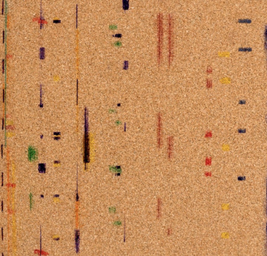 Image: Raffaella della Olga, T50 (detail), 2024, typewritten with carbon paper and ink ribbon on drawing paper and tracing paper, with cork cover. Special Collections, Center for Curatorial Studies Library & Archives, Bard College, Annandale-on-Hudson, New York