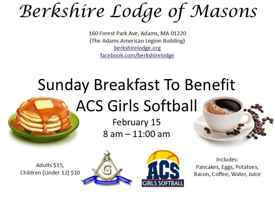 The Berkshire Lodge of Masons will be putting on Breakfast Buffet for the Benefir of the ACS Softball from 8:00 am to 11:00 am at the American Legion, 160 Forest Park Ave, Adams, MA