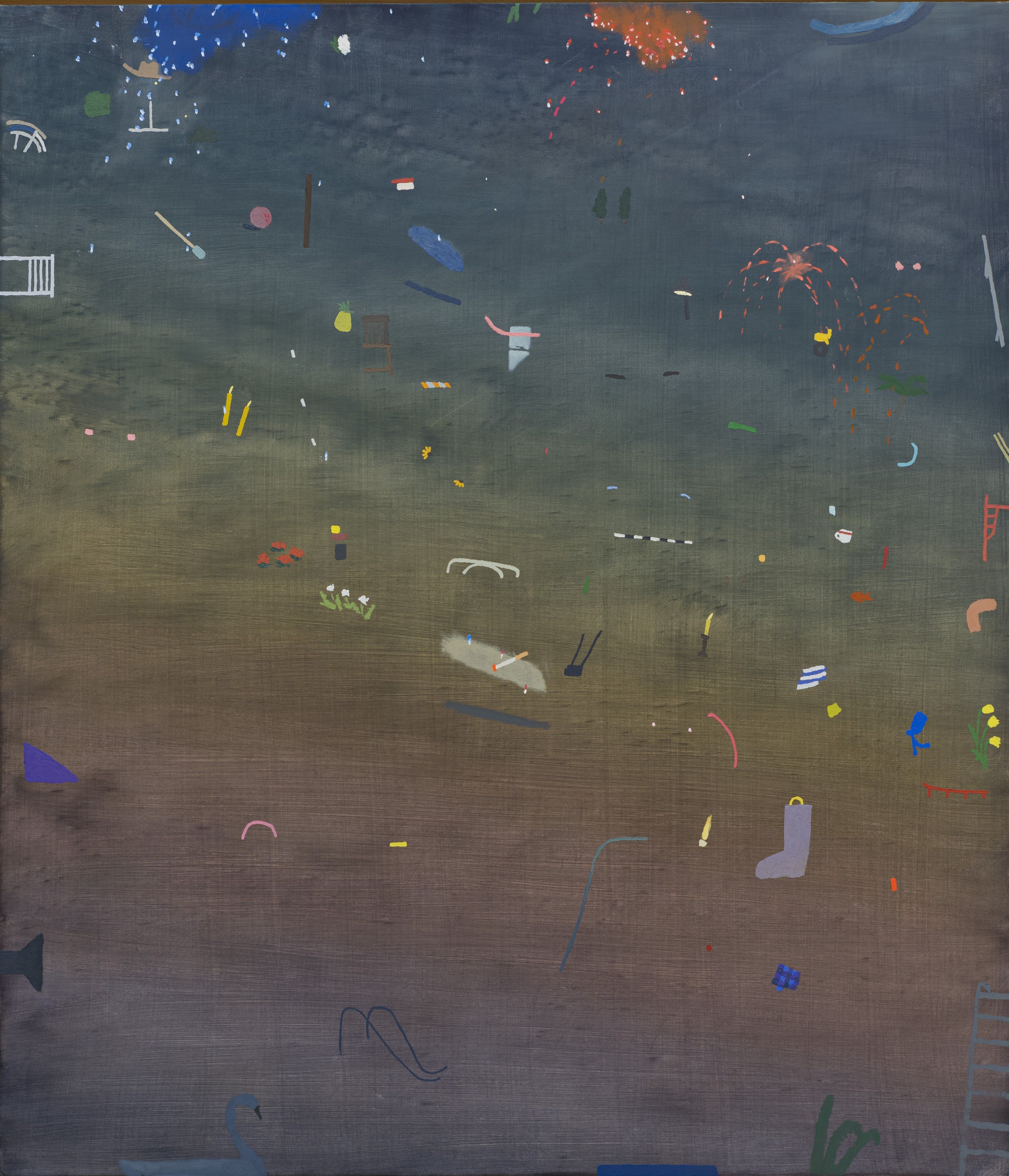 Mariel Capanna-Cigarette, Candles, Fireworks, Swan 2022 Oil, wax, and chalk on panel Courtesy of the artist and Adams and Ollman