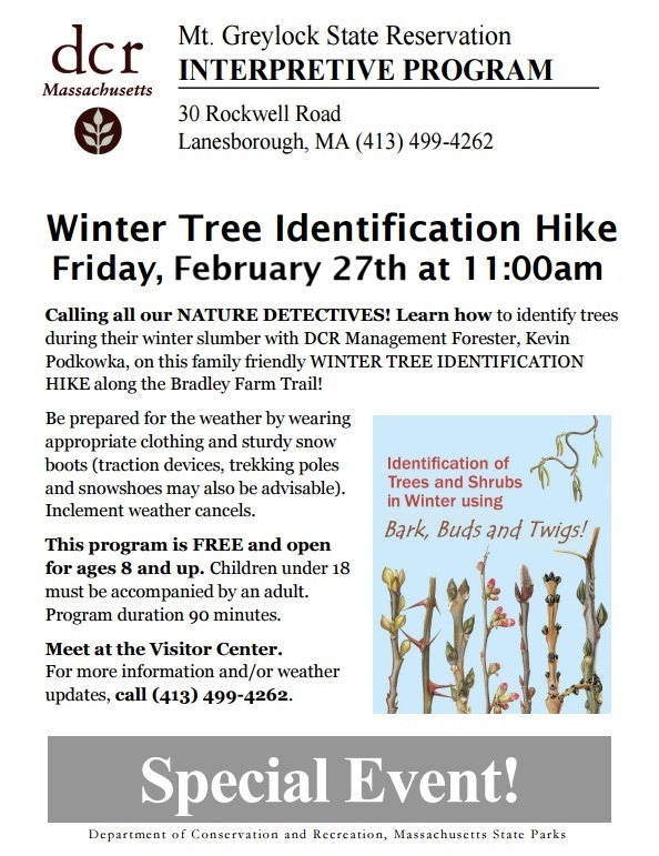 Learn how to identify trees during their winter slumber with DCR Management Forester, Kevin Podkowka, on this family friendly Winter Tree Identification Hike along the Bradley Farm Trail!